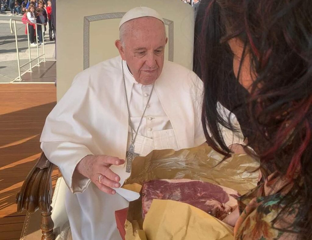 Dalla Toscana al Vaticano con amore, possibilmente cotto “al sangue”. Maria Pavese, titolare della storica macelleria Giaccherini di Terranuova Bracciolini, ha regalato a papa Francesco una bistecca di Chianina del peso di 3 chili.