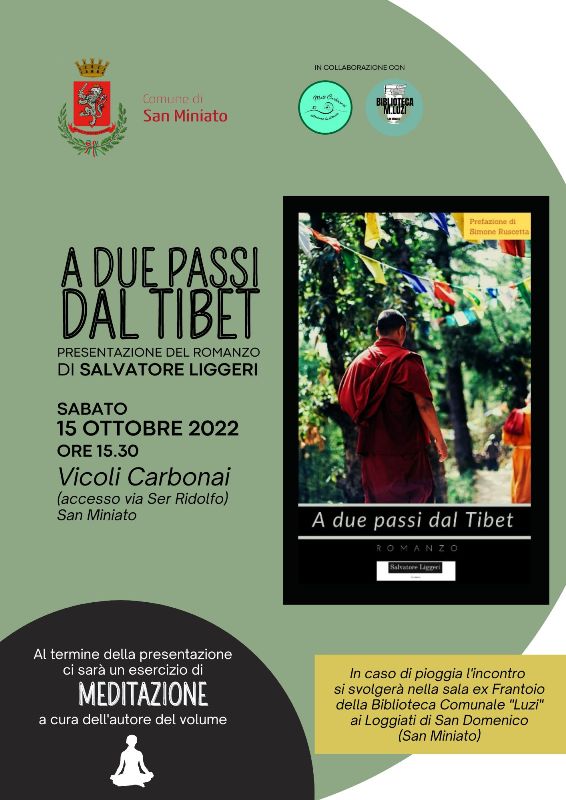 Sabato 15 ottobre, alle ore 15.30, nel Vicolo Carbonaio (accesso da via Ser Ridolfo) sarà presentato l’ultimo romanzo di Salvatore Liggeri "A due passi dal Tibet", che ha voluto raccontare la sua esperienza di vita condivisa con la fidanzata Sara e con altri ragazzi conosciuti nel monastero tibetano di Pomaia all’Istituto Lama Tzong Khapa.