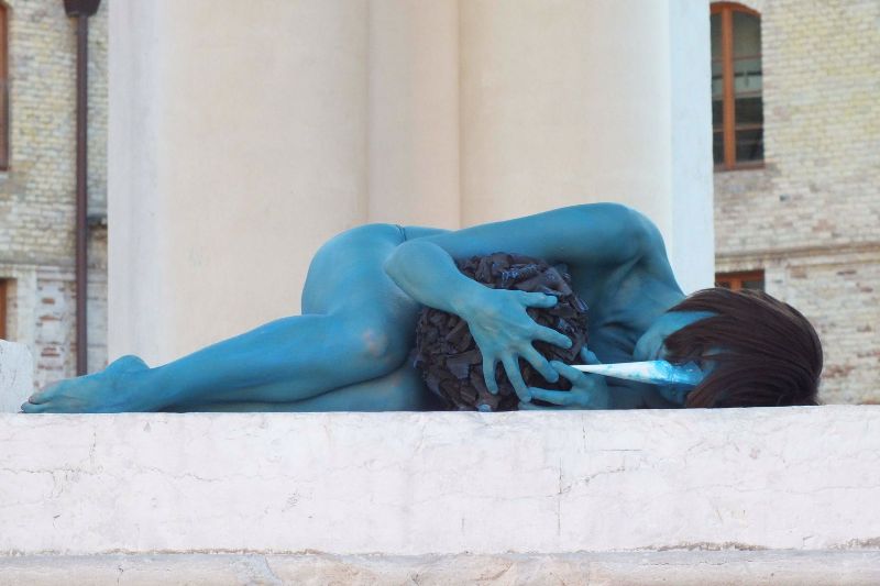 Ma dalle favole alla modernità il passo è breve; ecco allora gli incontri con artisti capaci di creare nuove mitologie impossibili. È il caso di quello ad Ancona con Gino De Dominicis (1947-1998) artista concettuale che dissacrò, mettendo un naso di pinocchio ad un teschio, quella morte a cui diceva pressappoco: ti farò esistere senza che tu elimini la vita, semplicemente tenendoti a debita distanza. Così anche il suo gigantesco scheletro di 24 metri disteso nella ex chiesa della SS. Trinità in Annunziata di Foligno con in mano una sottile asta dorata che mira al cielo, dal titolo Calamita cosmica, diventa per Vezzosi una provocatoria tematica da riproporre nella “fanciulla blu” accovacciata su di una sfera in fronte alla Mole Vanvitelliana di Ancona. Ed ancora l’assurdo tentativo dell’artista di produrre onde quadrate gettando sassi nel lago, suggerisce a Vezzosi una serie di quattro scatti che vede una fanciulla liberarsi allorché il cerchio generato dalle onde la contiene.