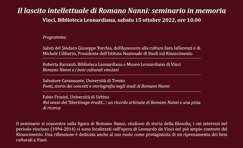 Un seminario in memoria di Romano Nanni, in passato direttore del Museo Leonardiano e della Biblioteca Leonardiana. Ad organizzarlo l'Istituto nazionale di studi sul Rinascimento e il Comune di Vinci, alla Biblioteca Leonardiana il 15 ottobre (a partire dalle ore 10): la giornata si concentra sugli studi fatti da Nanni su Leonardo da Vinci. Il programma prevede i saluti del sindaco di Vinci Giuseppe Torchia, della vicesindaca e assessora alla Cultura Sara Iallorenzi e del presidente dell'Istituto nazionale di studi sul Rinascimento Michele Ciliberto. A seguire Roberta Barsanti farà un intervento dal titolo 'Romano Nanni e i beni culturali vinciani'. Spazio poi a Salvatore Carannante, dell'Università di Trento, con l'intervento 'Fonti, storia dei concetti e storiografia negli studi di Romano Nanni”.Il seminario si concluderà con Fabio Frosini dell'Università di Urbano. 'Nel senso del libertinage érudit...’: un ricordo urbinate di Romano Nanni e una pista di ricerca', il suo approfondimento.