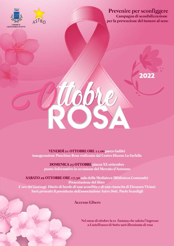Un nastro rosa appuntato sulla maglietta e molto di più. Il Comune di Castelfranco di Sotto patrocina e sostiene Ottobre Rosa, iniziativa promossa dall’Associazione ASTRO Onlus (associazione per il Sostegno Terapeutico e Riabilitativo in Oncologia) in collaborazione con l’Unione dei Comuni del Circondario Empolese-Valdelsa e i Comuni del Valdarno, con alcune attività di sensibilizzazione sull’importanza vitale della prevenzione e della diagnosi precoce dei tumori al seno, sui corretti stili di vita da adottare e sui controlli diagnostici da effettuare. Ottobre Rosa ha l’obiettivo di allargare il più possibile l’informazione fra le donne, giovani e meno giovani.