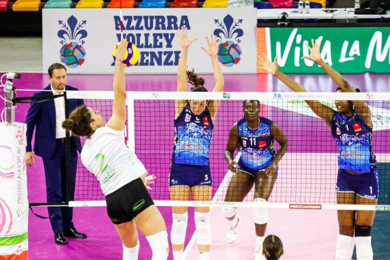 Nel secondo set le ospiti provano subito a cambiare l’inerzia salendo 0-4 con attacco e muro di Omoruyi, poi il tocco di Lualdi su ricezione slash (3-8) costringe Bellano a usare il suo primo time out: l’emorragia continua (3-11), entra Kosareva per Van Gestel ma un altro errore in ricezione regala a Busto il 3-12 con conseguente nuovo time out di Bellano. Firenze prova a reagire, Musso trova punti anche dalla panchina con l’ace di Battista, poi sul 14-20 Nwakalor si infortuna cadendo male dopo un muro: al suo posto entra Adelusi, Il Bisonte si avvicina fino al 16-21 ma poi Degradi accelera di nuovo e alla fine chiude Monza con un tocco di seconda (17-25).