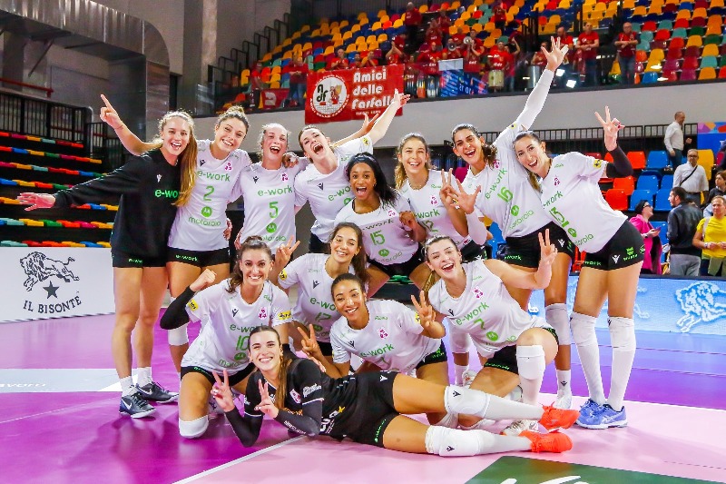 Al tie break tornano Van Gestel e Alhassan, mentre Musso conferma Olivotto. Il break de Il Bisonte dal 2-4 al 5-4 con muro di Nwakalor (ben sei in totale con 20 punti) provoca il time out ospite, ma poi sono due muri consecutivi di Zakchaiou a portare al cambio campo sul 6-8: Bellano inserisce Knollema per Van Gestel, una scatenata Rosamaria trova attacco e ace del 6-10, poi Bellano prova il doppio cambio con Guiducci e Kosareva per Nwakalor e Cambi, ma la E-Work allunga fino all’8-13 e poi va a chiudere con l’errore di Herbots (10-15).