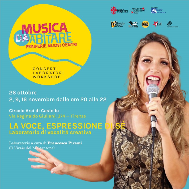 Il prossimo appuntamento in programma, mercoledì 26 ottobre al Circolo Arci di Castello, è con il laboratorio di vocalità creativa "La voce, espressione di sé", a cura di Francesca Pirami (Il Vivaio del Malcantone aps). Rivolto ai ragazzi (dai 15 anni in su) e agli adulti che abbiano voglia di scoprire o approfondire le possibilità espressive della propria voce in modo naturale e creativo, il laboratorio si svolgerà in quattro appuntamenti (tutti i mercoledì dal 26 ottobre al 16 novembre, ore 20-22). La partecipazione è gratuita, ma è richiesta la prenotazione (scrivere a: francesca.pirami@gmail.com). Tutti i partecipanti potranno fare/rinnovare la tessera Arci direttamente alla sede del Circolo.