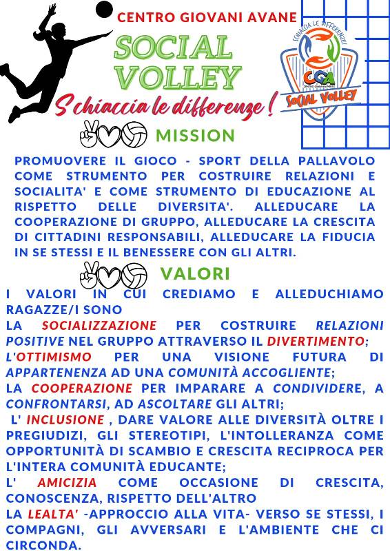 Dopo lo scorso anno di sperimentazione del Social Volley condotto da Elena Paoli (educatrice CGA e allenatrice FIPAV pallavolo) e Martina Benassai ( insegnante laureata in scienze motorie e giocatrice di pallavolo) la nuova attività è pronta a ripartire e a promuovere la sua mission e i suoi valori per una cultura non solo dello Stare con gli altri, ma anche Fare con gli altri e Contare per gli altri, allenando l'empatia rinforzando le attitudini sociali positive tramite comportamenti sportivi di rispetto reciproco e cura dell'altro. Lo scopo del progetto è quello di fare vivere ai ragazzi e alle ragazze esperienze di gioco della pallavolo cooperando insieme, conoscendosi nelle diversità, rispettando l'avversario e se stessi per l'inclusione e il divertimento di tutti.