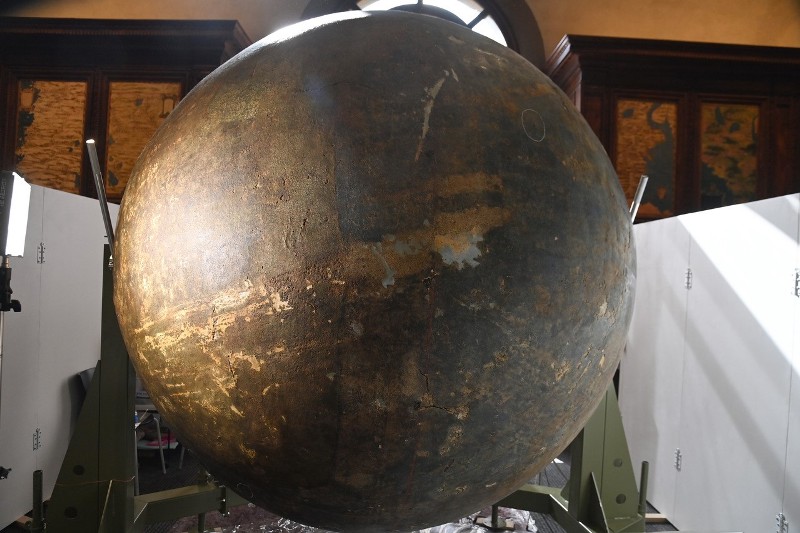 Attualmente la pulitura è in fase di completamento. L’intervento proseguirà nei prossimi mesi con la stuccatura delle lacune e l’integrazione pittorica sottotono delle numerose mancanze di colore. Il restauro si è svolto alla vista dei visitatori del museo nella Sala della Guardaroba, dove il mappamondo è stato smontato dai suoi elementi in metallo e sistemato su una struttura temporanea, appositamente progettata e realizzata per consentire ai restauratori di ruotarlo e intervenire agevolmente su tutta la superficie.
