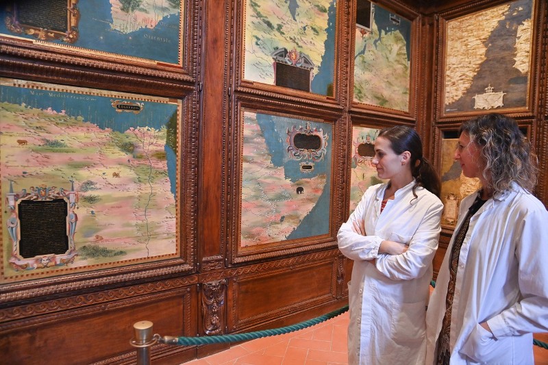 Le carte, 53 dipinti a olio su tavola con supporti lignei, inserite negli sportelli dei monumentali armadi, offrono una dettagliata rappresentazione di terre e mari noti ai tempi di Cosimo I, impreziosite da una miriade di iscrizioni dorate, raffinati cartigli, imprese medicee e creature fantastiche, sono state staccate e restaurate nella sala attigua che già ospitò il restauro del putto che decora il Terrazzo di Giunone al terzo piano del museo, recuperato un anno fa sempre grazie a Friends of Florence. Il mappamondo invece, troppo grande per cambiare sala (ha una circonferenza di oltre due metri), è stato solo spostato all’interno della sua sede via via che i lavori sono andati avanti.