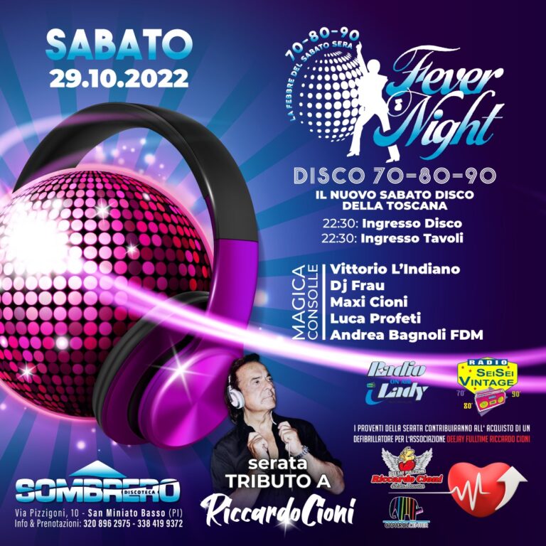 Serata dedicata a dj Riccardo Cioni al Sombrero di San Miniato Basso. Sabato 29 ottobre torna la Fever Night, in collaborazione con Radio Lady 97.7 e Radio SeiSei Vintage. Si alterneranno al mixer Vittorio L'Indiano, dj Frau, Maxi Cioni, Luca Profeti e Andrea Bagnoli FDM. I proventi della serata andranno all'associazione benefica Deejay Fulltime Riccardo Cioni per l'acquisto di un defibrillatore.