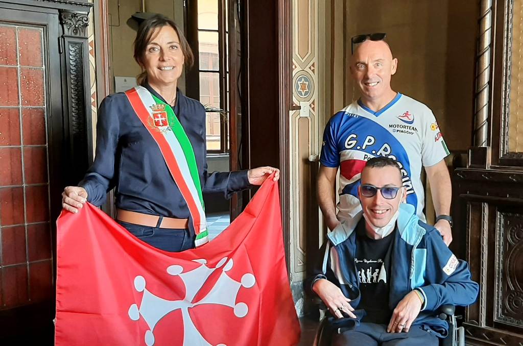 La vicesindaco Raffaella Bonsangue ha consegnato la bandiera di Pisa a Federico Mataresi e Francesco Michelotti del Gruppo Podistico Rossini che il prossimo 6 novembre parteciperanno insieme alla maratona di New York.