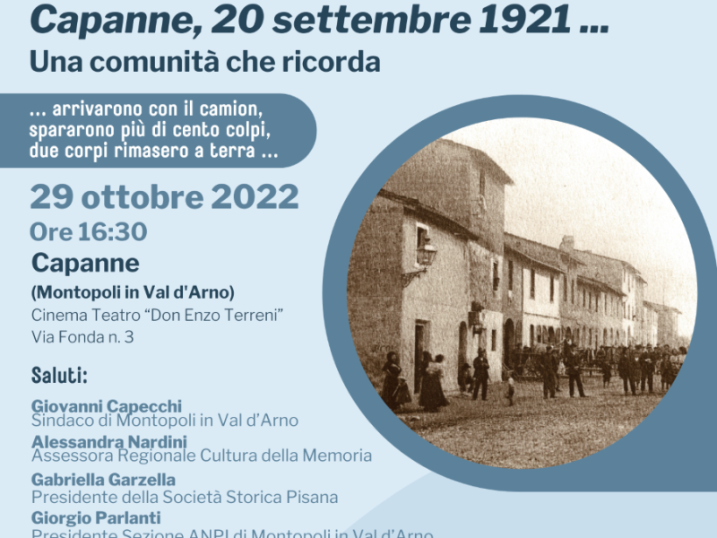 Il Comune di Montopoli in Val d'Arno, in collaborazione con ANPI Montopoli in Val d'Arno - Sez. "Serafino Soldani", Società Storica Pisana e Consulta di frazione di Capanne, con il patrocinio di Regione Toscana organizza l'iniziativa pubblica: “Capanne, 20 settembre 1921. Una comunità che ricorda”