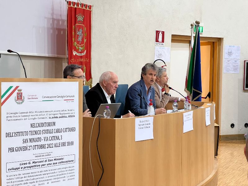 Quale sarà il futuro del liceo G. Marconi di San Miniato? Dove troverà sede il liceo scientifico dopo i traslochi iniziati dal 2008? Domande, risposte e previsioni sono state comprese nel Consiglio comunale aperto che si è svolto all’Istituto superiore Cattaneo. Nell’Auditorium di via Catena presenti consiglieri comunali di maggioranza e opposizione, assessori, sindaci e rappresentanti di tutti i comuni del comprensorio del cuoio, preside e vicepreside delle due scuole superiori all'attenzione dell'ordine del giorno, cittadini e genitori dei giovani studenti. Alla guida dell’incontro il presidente del Consiglio comunale Vittorio Gasparri, il sindaco Simone Giglioli, il presidente della provincia di Pisa Massimiliano Angori e il segretario Danilo D’Aco.