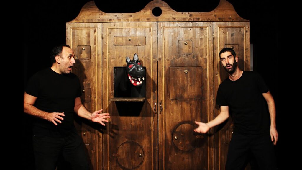Due attori, spaventati ma curiosi, si avvicinano ad uno strano armadio comparso all’improvviso…che cosa ci sarà dentro? Vecchi costumi teatrali? Polverose parrucche? E cosa si nasconde nell’armadio di ogni bambino? Mostri, streghe, marmocchi dispettosi, draghi, principi, fate? A causa di un lupo alquanto dispettoso, i due attori sono costretti ad aiutare le misteriose creature che si nascondono nell’armadio e a spaventare tutti i bambini presenti in sala. I protagonisti escono magicamente e prendono vita, in un esilarante carosello di storie vecchie e nuove che tentano di spaventare, ma fanno solo divertire. Gran finale con un’esaltante battaglia di cuscini tra gli spettatori.