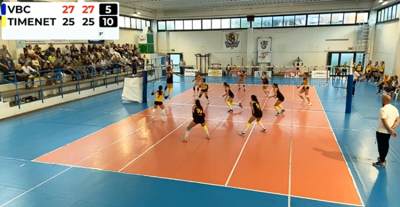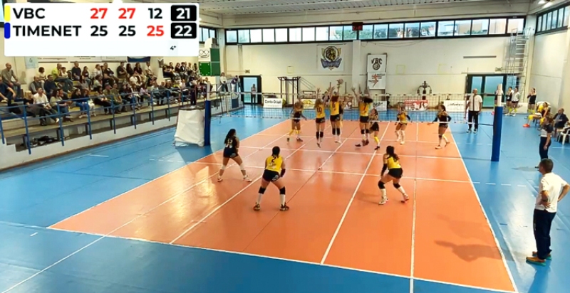 Le due formazioni ingaggiano subito il duello con le giallonere impegnate a rincorrere la VBC dando prova di un bel recupero iniziale che dal 6-2 le porta a procedere di pari passo fino a metà set. La VBC Viterbo tenta di smarcarsi ma la Timenet è sempre alle sue spalle finché, superato l’ennesimo pareggio a quota 21 punti, riesce finalmente a conquistare il vantaggio raggiungendo il 22-24. Tuttavia, le giallo blu annullano il set point e poi ribaltano la situazione chiudendo 27-25.