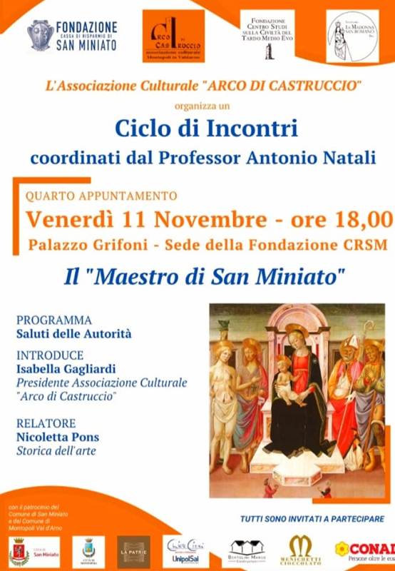 L'Associazione Culturale Arco di Castruccio, in collaborazione con la Fondazione Centro Studi sulla Civiltà del Tardo Medio Evo e con i Frati Minori del Convento Francescano di San Romano, organizza il quarto appuntamento del Ciclo di Incontri coordinati dal Professor Antonio Natali, ex direttore della Galleria degli Uffizi e adesso consulente culturale per l’associazione Arco di Castruccio, dal titolo "Il Maestro di San Miniato". Parliamo di un'artista del secondo Quattrocento tra i più prolifici in Toscana, la cui opera principale è la pala della chiesa di San Domenico a San Miniato.