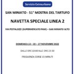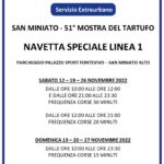 Autolinee Toscane informa che, su richiesta del Comune di San Miniato, effettuerà il servizio navetta di collegamento tra San Miniato Basso e San Miniato piazza Dante in occasione della 51-ma Edizione della Mostra Nazionale del Tartufo Bianco, che si terrà nei giorni 12, 13, 19, 20, 26 e 27 novembre.
