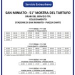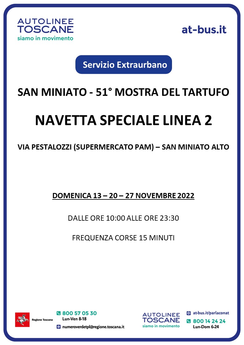Autolinee Toscane informa che, su richiesta del Comune di San Miniato, effettuerà il servizio navetta di collegamento tra San Miniato Basso e San Miniato piazza Dante in occasione della 51-ma Edizione della Mostra Nazionale del Tartufo Bianco, che si terrà nei giorni 12, 13, 19, 20, 26 e 27 novembre.