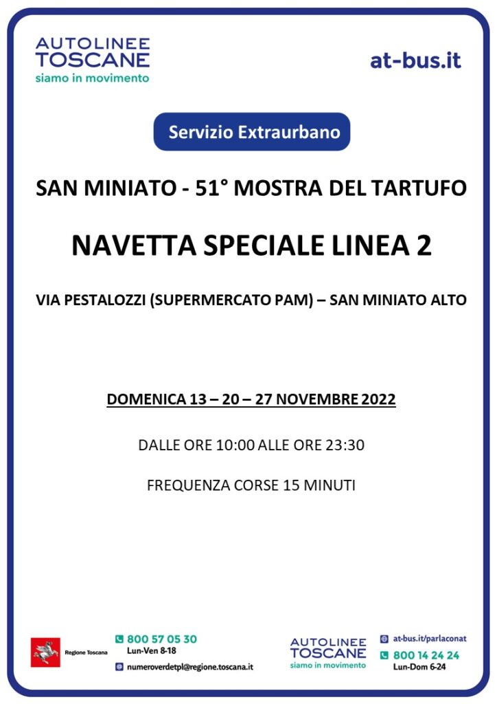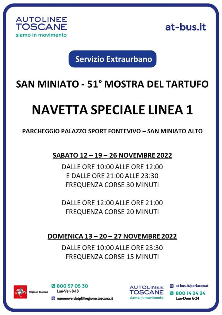 Autolinee Toscane informa che, su richiesta del Comune di San Miniato, effettuerà il servizio navetta di collegamento tra San Miniato Basso e San Miniato piazza Dante in occasione della 51-ma Edizione della Mostra Nazionale del Tartufo Bianco, che si terrà nei giorni 12, 13, 19, 20, 26 e 27 novembre.