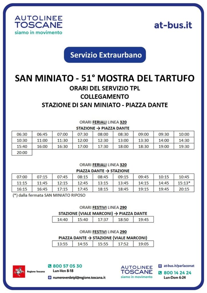 Autolinee Toscane comunica inoltre che, per chi giunge a San Miniato in treno, può fruire dei servizi TPL, autolinea 320 nei giorni feriali e autolinea 290 nei giorni festivi, di collegamento tra la Stazione Ferroviaria, San Miniato Basso e San Miniato piazza Dante. (si veda allegato Linee 320 e 290)