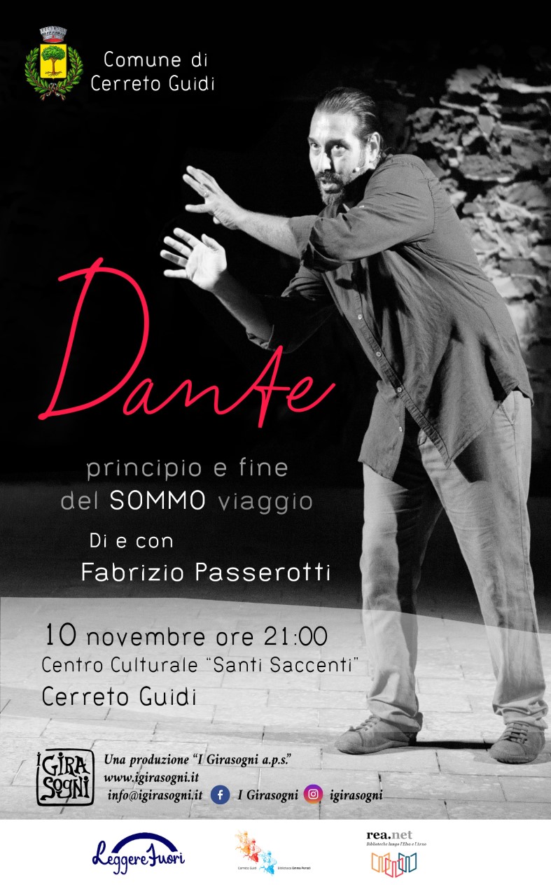 Inclusa nella rassegna ‘Leggere Fuori’, Giovedì 10 Novembre alle ore 21,00 al Centro Culturale “Santi Saccenti”, a Cerreto Guidi, è in programma “Dante: Principio e fine del sommo viaggio” di e con Fabrizio Passerotti. L’iniziativa, una produzione “I Girasogni a.p.s”, è organizzata dal Comune di Cerreto Guidi e dalla Biblioteca comunale “Emma Perodi”, in collaborazione con REA.net.