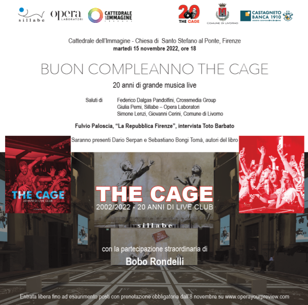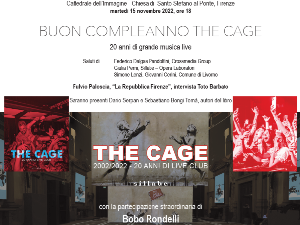 Martedì 15 novembre, alle ore 18, la Cattedrale dell’Immagine, prossima a diventare la casa della street art mondiale, ospiterà il “compleanno” del The CAGE, uno tra i più importanti live club a livello nazionale, ma non solo. L’occasione sarà la presentazione del libro "The Cage: 2002/2022 – 20 anni di live club" – promosso dall’Associazione The Cage e dal Comune di Livorno ed edito da Sillabe in collaborazione con Opera Laboratori – che celebra due decadi di vita di una realtà oggi riconosciuta a livello nazionale e anche all’estero, ma che si è fatta nel tempo grazie ad anni di sacrifici, sogni e voglia di colmare un vuoto in città.