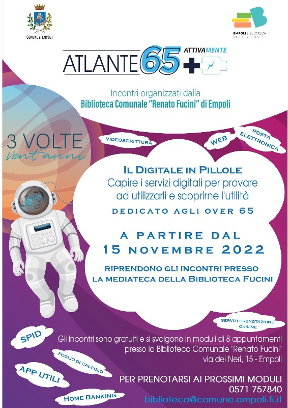 A 'lezione' di nuove tecnologie, così da essere più autonomi nell'utilizzo di smartphone e computer e più sicuri di fronte ai vari servizi online. Tornano alla biblioteca comunale Renato Fucini di Empoli le 'Pillole digitali' per Over 65: inaugurate nel 2020 nell'ambito del progetto "Il digitale in pillole", sono parte del programma "3 volte 20 anni", un ricco calendario di proposte culturali dedicate agli Over 65, spesso neopensionati, con tanta voglia di mettersi in gioco in attività che permettano loro di acquisire nuove competenze. Competenze spendibili nelle commissioni di ogni giorno, utili per semplificarsi la vita: il primo appuntamento, martedì 15 novembre 2022, sarà per esempio dedicato allo Spid (Sistema pubblico di identità digitale), ma nel corso delle iniziative i temi proposti saranno vari, dalla prenotazione dei prelievi on line all'utilizzo di Office e della posta elettronica o ancora la scoperta di app utili nella quotidianità di ognuno.