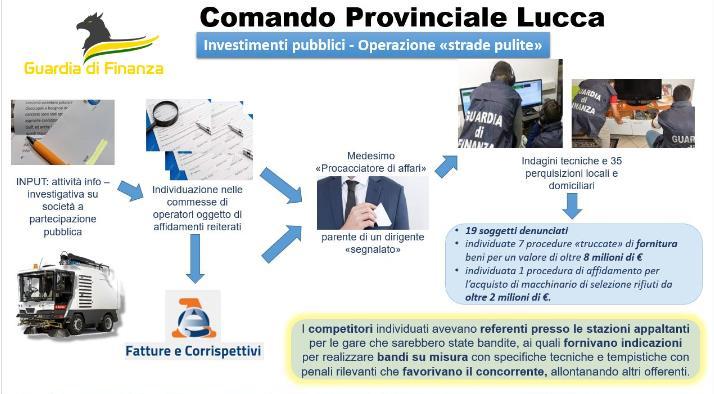 L'operazione della guardia di finanza di Lucca ha portato a evidenziare una serie di gare riferite al noleggio di spazzatrici stradali, automezzi e di un macchinario per il trattamento rifiuti. Un solo partecipante si è aggiudicato in assenza di offerte competitive come prezzo e requisiti tecnici. Il 'competitor', seppure fosse unico partecipante, aveva rapporti commerciali con un procacciatore d'affari che aveva un parente all'interno della stazione appaltante.