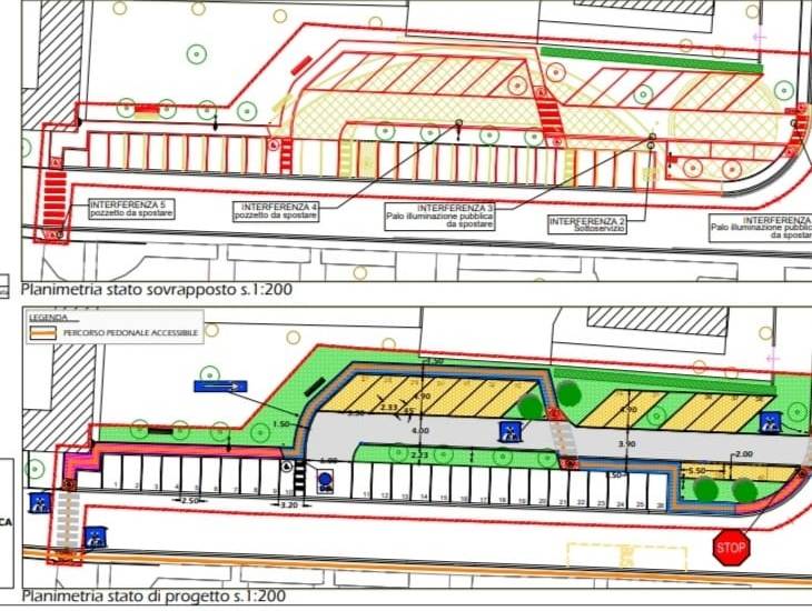 Verranno realizzati 14 nuovi posti auto a lisca di pesce inclinati a 45° disimpegnati da una corsia di manovra a senso unico di circa 4,00 m in grado di facilitare il transito dei veicoli. Il nuovo parcheggio permetterà così di passare dagli attuali 26 ai 40 posti auto.