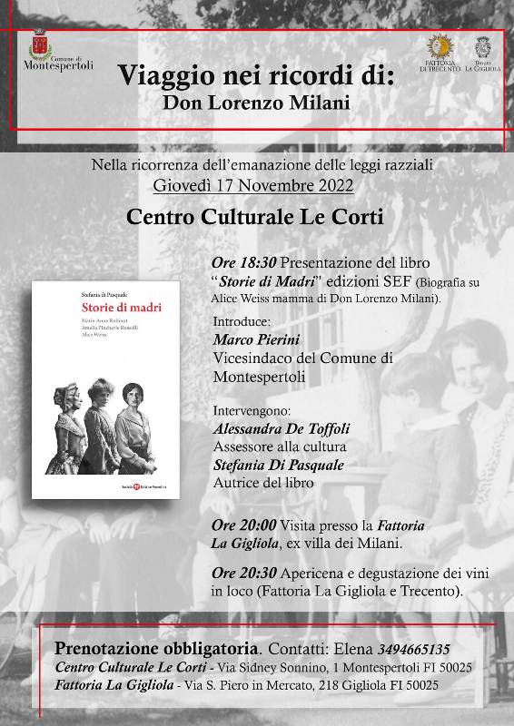 L’appuntamento è per giovedì 17 novembre al Centro culturale "Le Corti" alle ore 18:30: introduce l’evento il vicesindaco di Montespertoli, Marco Pierini e interverranno l’Assessore alla Cultura, Alessandra De Toffoli e l’autrice Stefania di Pasquale. La serata si concluderà con una visita con apericena e degustazione vini delle cantine La Gigliola e Fattoria Trecento presso la Fattoria La Gigliola, villa che apparteneva alla famiglia Milani.