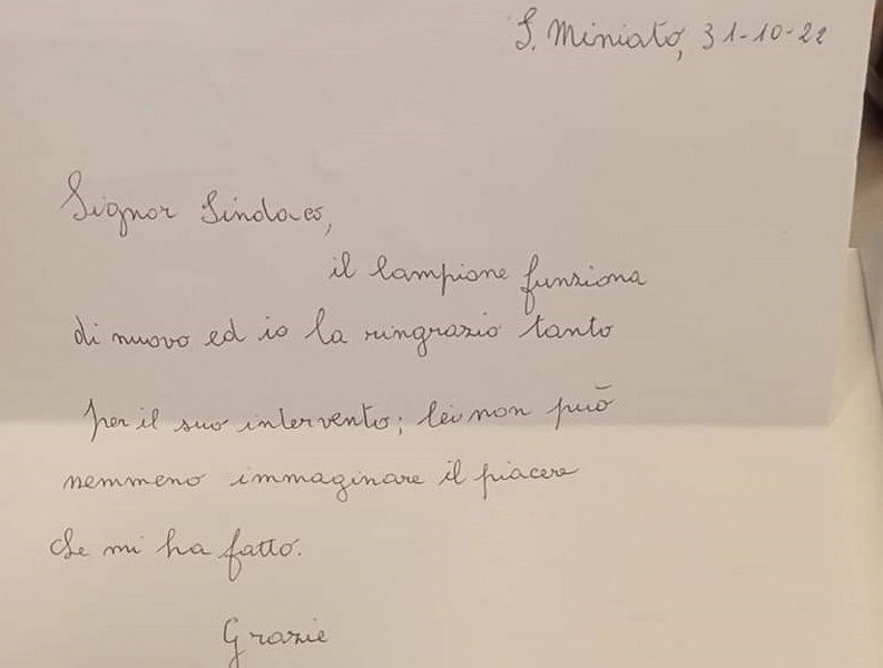 "Signor sindaco, il lampione funziona di nuovo e io la ringrazio tanto per il suo intervento; lei non può nemmeno immaginare il piacere che mi ha fatto. Grazie."