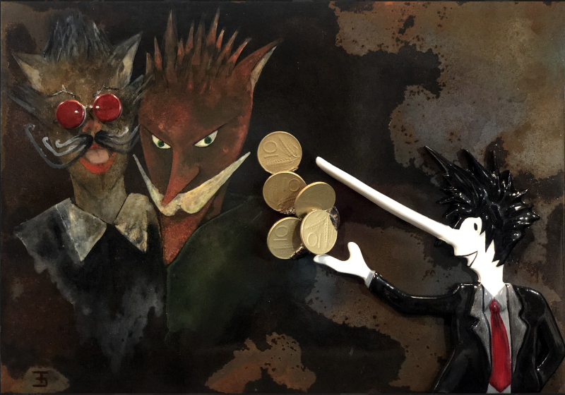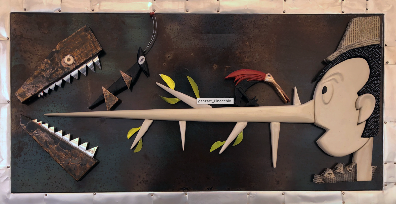 Non è un caso dunque che molti dei loro soggetti si ispirano alla magia della favola; in particolare saranno in mostra quelli realizzati per la favola italiana più bella, quella che ha come protagonista Pinocchio. Un assemlage prezioso in cui accanto alla doratura c’è il raffinato utilizzo di materiali di recupero: lattine, plastica, elementi metallici e frammenti naturalistici.