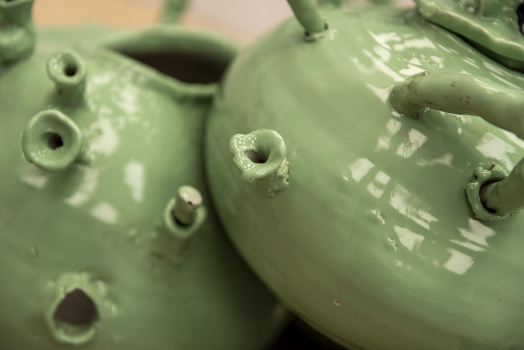Il filo conduttore dell’intervento di Serena Fineschi “La primavera dell’impazienza” è, appunto, l’impazienza, una delle caratteristiche del nostro tempo, il cui emblema involontario è rappresentato dal popcorn. Fineschi ha lavorato su tre ambiti che restituiscono gli esiti in tre installazioni: la prima riproduce i popcorn in ceramica con diverse tecniche, la seconda presenta i bicchieri da cocktail prodotti con i partecipanti al suo workshop, che trattengono, nelle forme “sconvolte”, i gesti e le emozioni di chi li ha realizzati; il terzo intervento, in collaborazione con Patrizio Bartoloni, restituisce invece un ruolo di primo piano al “piedino”, elemento imprescindibile di ogni bottega, tanto presente quanto non considerato, indispensabile nelle fasi di produzione.
