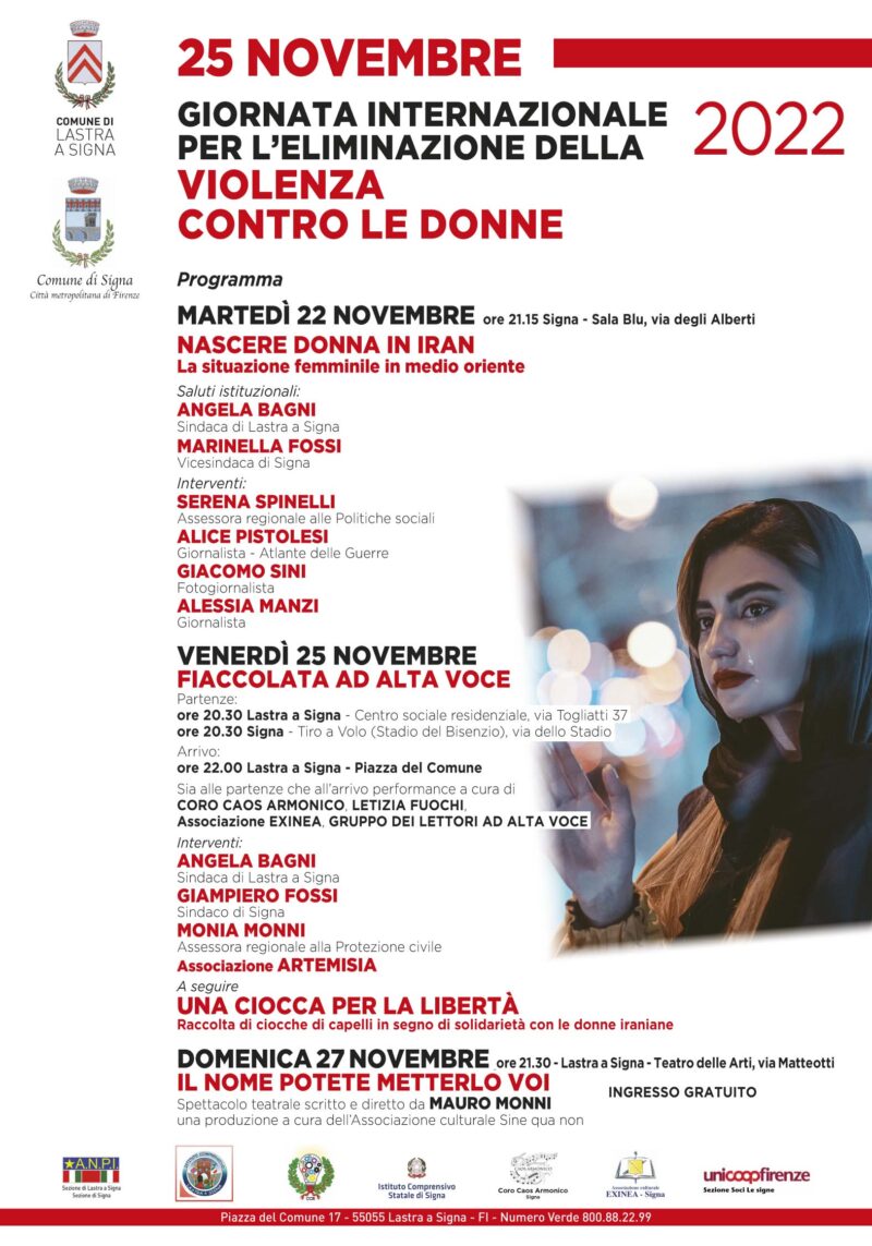 Al punto di arrivo si terranno i saluti istituzionali del sindaco di Lastra a Signa Angela Bagni, del sindaco di Signa Giampiero Fossi, dell’assessore regionale alla Protezione Civile Monia Monni e di un rappresentante dell’Associazione Artemisia. Nell’ambito della manifestazione si terrà anche la raccolta di ciocche di capelli in segno di solidarietà con le donne iraniane. Durante la fiaccolata saranno distribuite le bandane rosse realizzate dalle volontarie del Laboratorio Auser.