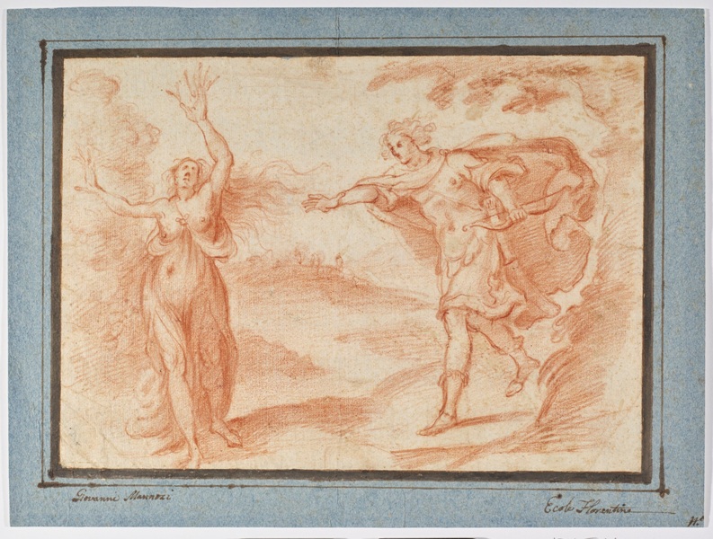Apollo, innamorato perdutamente di Dafne senza essere ricambiato, invece di rispettare la scelta dell’amata trasforma il suo corteggiamento in inseguimento e, infine, in caccia della ninfa, la quale - sempre più disperata - implora il padre Peneo di liberarla dall’ossessione di Apollo: le sue preghiere saranno esaudite ma la povera Dafne verrà trasformata in albero di alloro.