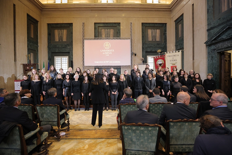 Ha concluso la cerimonia il neo costituito Coro di Ateneo, diretto dalla professoressa Elisabetta Miraldi, che ha intonato il Gaudeamus Igitur e altre armonie dal loro repertorio.