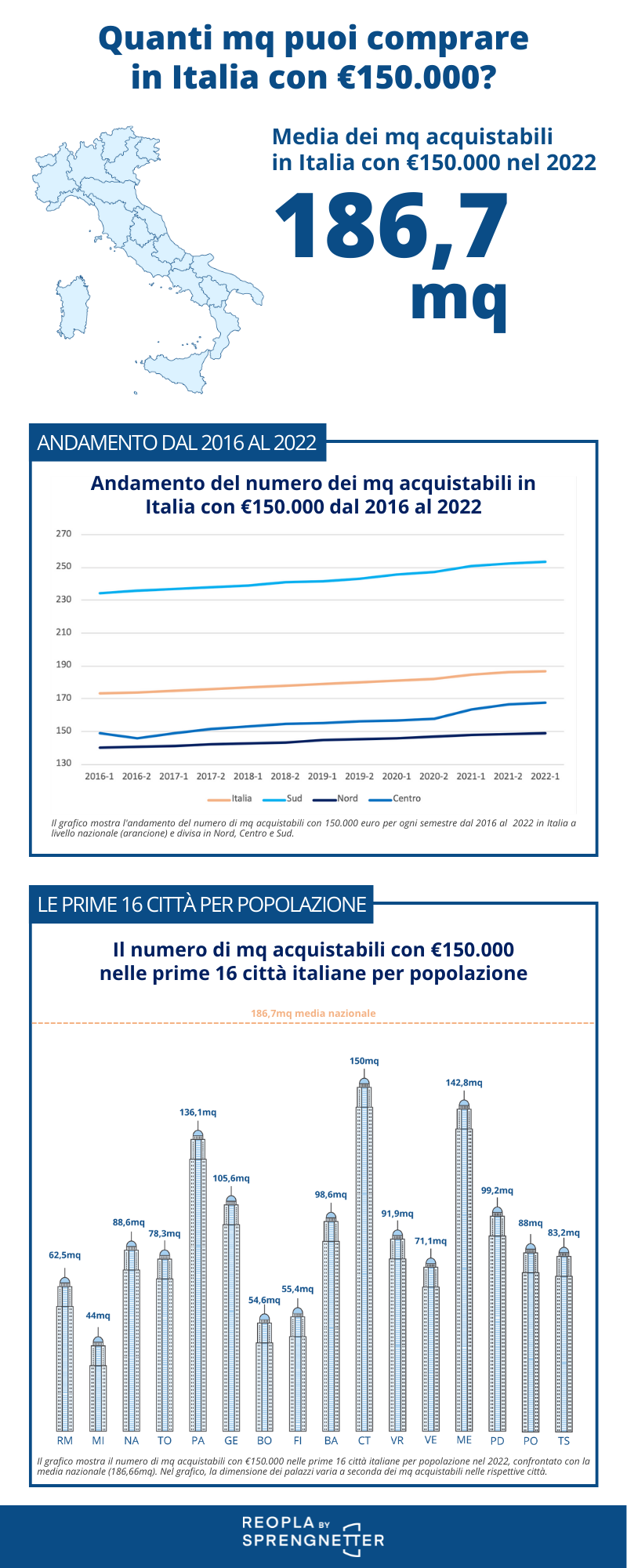 Sono alcuni dei risultati che emergono dal report “Quanti metri quadri puoi comprare con €150.000 in Italia?”* realizzato da Reopla, la società parte del gruppo Sprengnetter specializzata nella Big data Analysis e nella realizzazione di software innovativi e AVM (Automated Valuation Mode) per il settore immobiliare. La ricerca indaga quanti metri quadri si possono comprare nelle diverse province e nelle 16 città italiane più popolose con €150.000, confrontando la variazione tra il 2016 e il primo semestre del 2022.