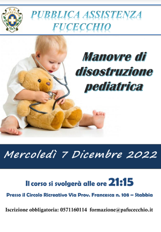 Un momento importante, perché conoscere certe semplici manovre può essere fondamentale per salvare la vita di un bambino: all’interno del corso di primo soccorso promosso dalla Pubblica Assistenza di Fucecchio a Stabbia, l’associazione guidata dal presidente Luigi Checchi organizza (per la serata di mercoledì 7 dicembre) un incontro – gratuito – per conoscere le manovre di disostruzione pediatrica. L’appuntamento è alle 21.15 al circolo ricreativo in via Provinciale Francesca n.110 a Stabbia. Il focus – offerto da personale formato e qualificato – richiede l’iscrizione al numero 057160114 oppure alla mail formazione@pafucecchio.it.