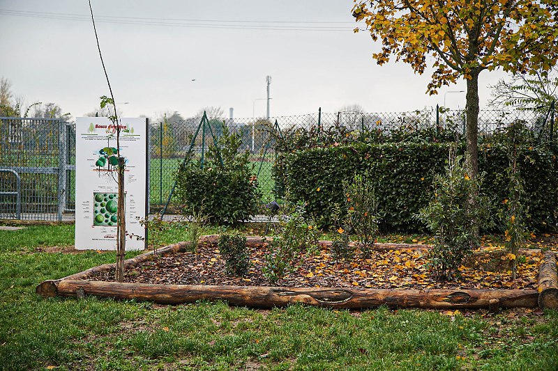 Le specie individuate per la piantagione del bosco comprendono il tiglio, che garantisce in autunno – inverno una pacciamatura naturale con le sue foglie che degradandosi apportano azoto al terreno e diversi arbusti da bacca senza spine negli anni permetteranno la creazione di passaggi, cunicoli, percorsi in cui i bambini si immergeranno letteralmente nella foresta, oltre ad altre piante come melograno, corbezzolo, nocciolo, sambuco, ma anche mirto, rosa canina, alloro, timo serpillo, santoreggia e ginepro.