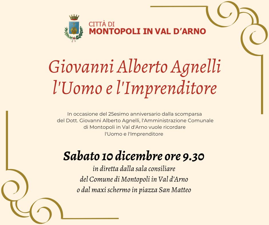 A partire dalle 9.30 si alterneranno sul palco della sala Pio XII uomini e donne delle istituzioni, amici, politici e imprenditori. Il giornalista Massimo Marini condurrà l'evento tra aneddoti e racconti in un percorso fatto di emozioni e riflessioni su ciò che Giovanni Alberto Agnelli ci ha lasciato. Saranno presenti alcuni familiari, il presidente della Regione Toscana Eugenio Giani e l'assessora regionale Alessandra Nardini.Per limiti di spazio la platea di sala Pio XII è riservata a coloro che hanno ricevuto l'invito all'evento. Tutti gli altri potranno seguire l'iniziativa dallo schermo posto nella sala del consiglio del Comune di Montopoli e dal maxischermo di piazza San Matteo.