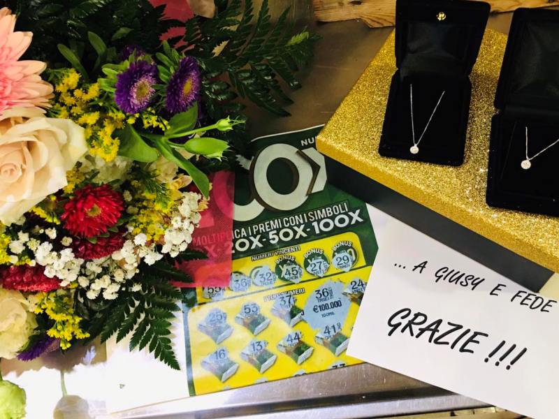Dopo aver vinto 100mila euro con un gratta e vinci ha pensato di ringraziare le due giovani bariste che glielo hanno venduto. E così, il misterioso e riconoscente vincitore, ha fatto recapitare due collanine d'oro e mazzi di fiori al locale. La storia arriva dal Bar 40mq, in via Setteponti ad Arezzo e a farla conoscere sono le due bariste Giuseppina e Federica, che sui social hanno postato la foto dei gioielli. I regali sono accompagnati da un bigliettino anonimo "...a Giusy e Fede grazie".