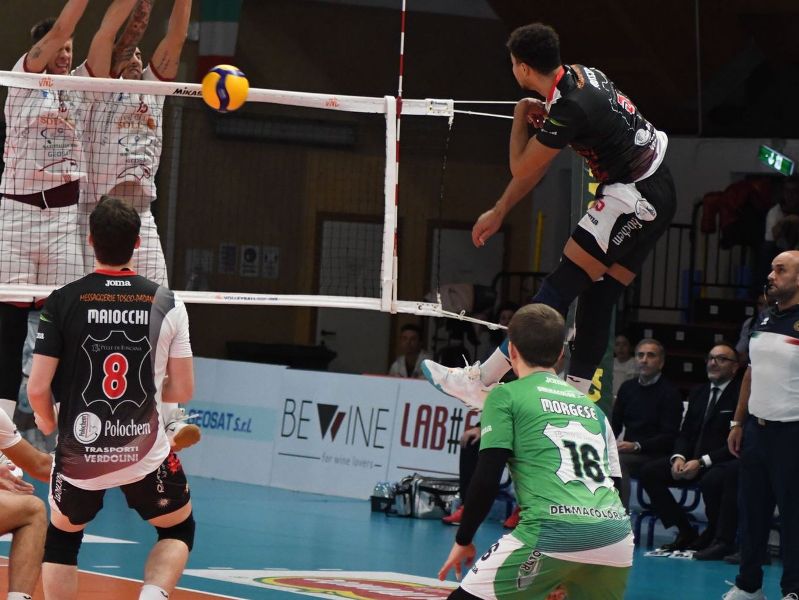 La lunga striscia positiva della Kemas Lamipel si interrompe sul più bello, in un turno infrasettimanale che avrebbe potuto regalare ancora più entusiasmo per preparare la grande sfida con Reggio Emilia di domenica pomeriggio. I buoni propositi santacrocesi, però, si sono infranti contro la prestazione solida e concreta di Cave del Sole Lagonegro. Trascinati da un Wagner stratosferico, autore di 29 punti, i lucani hanno giocato forse la miglior partita stagionale, andando a segno, con il muro, ben 17 volte, +10 nel fondamentale rispetto alla Kemas. Due le colpe principali dei biancorossi: la partenza “lenta” del primo set, ceduto agli avversari troppo facilmente, e il ribaltone subito nella terza frazione, con la partenza-sprint (1-6) vanificata da un super break di Cave del Sole, 11-3. Il quarto set sembrava poter dare almeno la chance di giocarsi la vittoria al quinto: gli ospiti lo hanno interpretato bene, ispirati da un Coscione che è riuscito a sfruttare al massimo il gioco dal centro dopo un set di pausa. I ragazzi di Mastrangelo, però, hanno sciupato cinque set-point di fila, chiaramente non solo per demeriti ma anche per la prestazione tutto cuore e niente errori da parte dei padroni di casa. Che al primo match-point, sul 27-26, hanno trovato il modo di chiudere infliggendo alla Kemas Lamipel il quinto stop stagionale. Top scorer della serata Matteo Maiocchi, con 22 punti. Biancorossi ancora al quarto posto, in attesa della sfida-verità di domenica pomeriggio al Pala Parenti, avversaria di turno la Conad Reggio Emilia, vera e propria “bestia nera” della passata stagione.