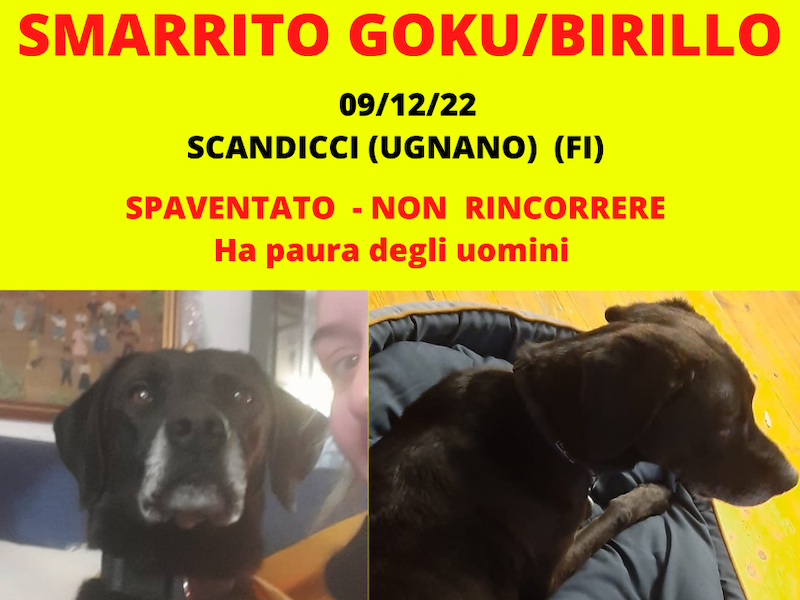 Un cagnolino è stato smarrito a Agnano, vicino Scandicci. Si chiama Goku ma risponde anche al nome di Birillo. È un meticcio taglia media colore nero con pettorina gialla e collare nero con medaglietta.