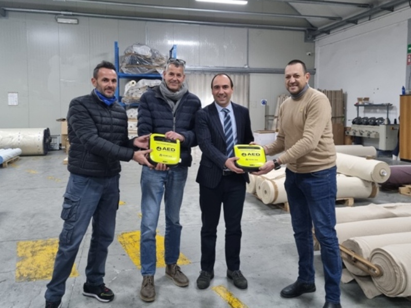 Ieri la consegna al sindaco di Montemurlo dal titolare di Tessitura Italia, che nel 2019 ha perso un amico per infarto: anche nella sua azienda ha installato un defibrillatore a disposizione di dipendenti e comunità