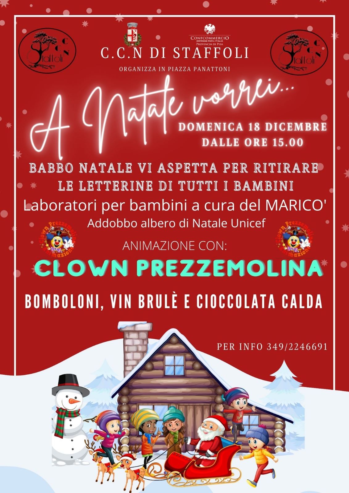 Il Natale arriva anche a Staffoli. Il Centro Commerciale Naturale di Staffoli, con il Comune di Santa Croce sull'Arno e Confcommercio Pisa, organizza in piazza Panattoni un evento dedicato ai più piccoli dal titolo 'A Natale vorrei...', che si terrà domenica 18 dicembre dalle ore 15.