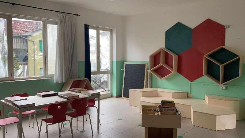 Nella mini biblioteca scolastica è stato installato un mobilio a misura di bambino: un tavolo grande con sedie, dei profili attaccati al muro a forma di esagono, librerie, sedute e pedane in legno. Tutti prodotti sicuri e garantiti, forniti dalla ditta di arredi GAM Gonzagarredi Montessori.
