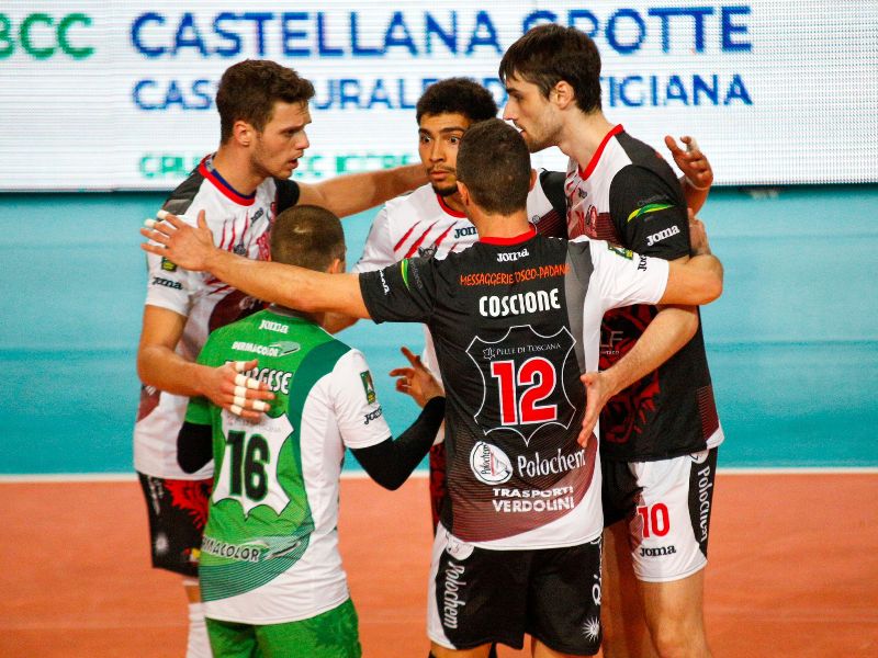 Primo set. Partono meglio i padroni di casa. Per ben due volte la formazione di Cannestracci prova a scappare, la seconda ci riesce guadagnando un margine di 4 punti. Di Silvestre e Theo Lopes girano bene in attacco, i biancorossi rispondono con un Truocchio subito in palla. Motzo riduce il gap tra le due formazioni, 21-17; Mastrangelo prova il tutto per tutto inserendo Arguelles per Coscione, ma il servizio dello stesso opposto finisce in rete scombinando la tattica di muro ospite. Sbaglia anche il play locale, a Hanzic non ne approfitta. S. Croce non riesce a prendere ritmo anche per gli errori in battuta. Motzo gioca mani e fuori per il cambio-palla, 23-19. La battuta è affidata a Compagnoni ma Di Silvestre porta i suoi a 24. Il primo set point lo annulla un errore al servizio di Presta, poi ancora Di Silvestre entra di prepotenza nel muro permettendo alla propria squadra di chiudere.