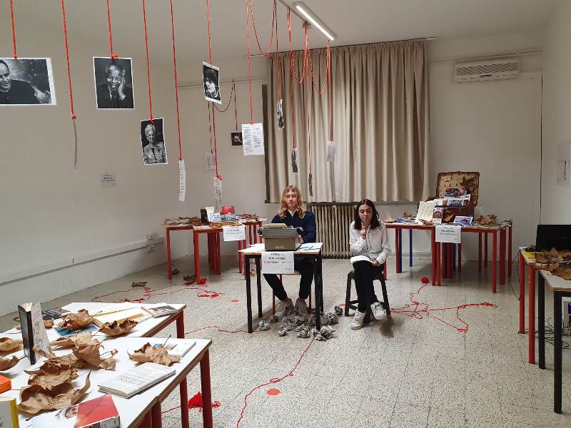 Per questo una classe era stata allestita con una scelta bibliografica e filmografica dedicata a quattro nuclei tematici legati agli articoli 2, 10, 27 34 della Costituzione italiana: al centro della stanza, al posto della lavagna, dominava un quadro in bianco e nero, abilmente realizzato a mano libera da una studentessa, che riproduce la celebre foto di Falcone e Borsellino, sorridenti in quell’eterno momento di complice amicizia durante il duro lavoro di Lotta alla mafia per cui hanno dato la vita.