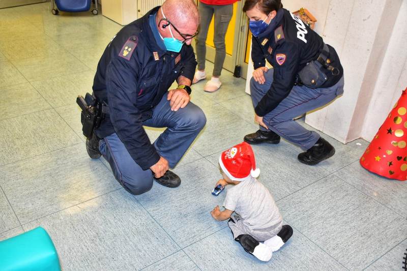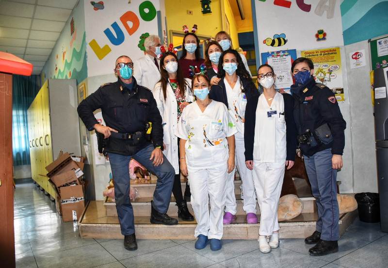 I poliziotti in divisa hanno portato la loro solidarietà anche ai sanitari, quotidianamente impegnati nel prendersi cura dei piccoli malati.