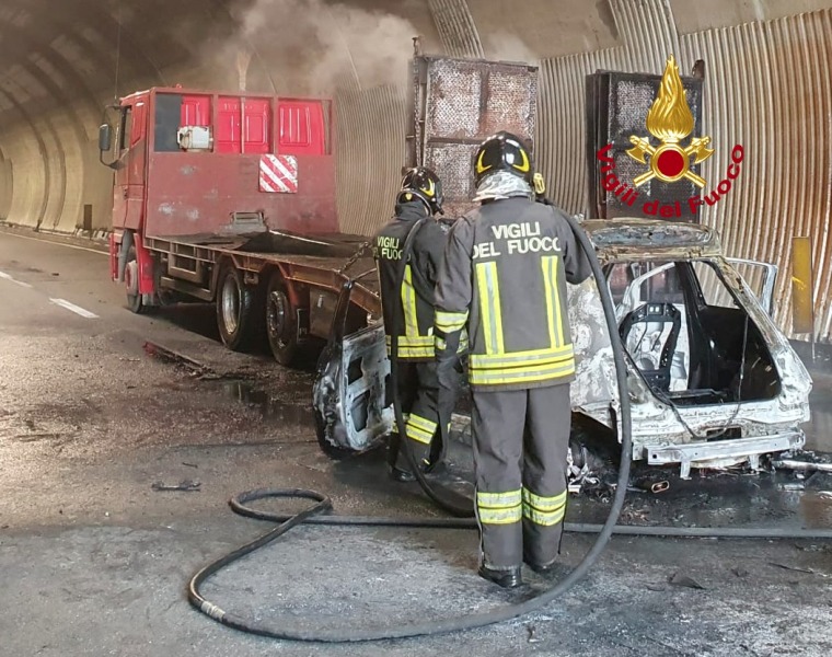 I Vigili del fuoco intervenuti con 3 automezzi, hanno effettuato lo spegnimento dell’auto e in parte del rimorchio. La circolazione è stata interrotta durante le fasi di soccorso dalla Polizia Stradale.