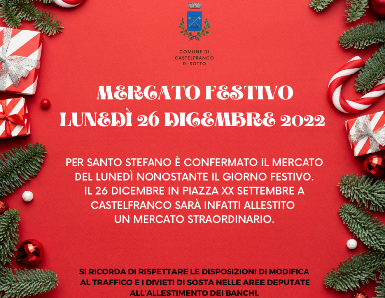 Per Santo Stefano viene confermato il mercato del lunedì nonostante il giorno festivo: il 26 dicembre in Piazza XX Settembre a Castelfranco sarà infatti allestito un mercato straordinario, l’unico del Comprensorio del Cuoio. L’Amministrazione Comunale di Castelfranco ha deciso di rinnovare l’appuntamento cittadino in accordo con i commercianti, gli ambulanti e le associazioni di categoria.