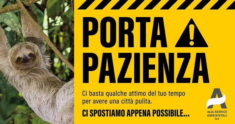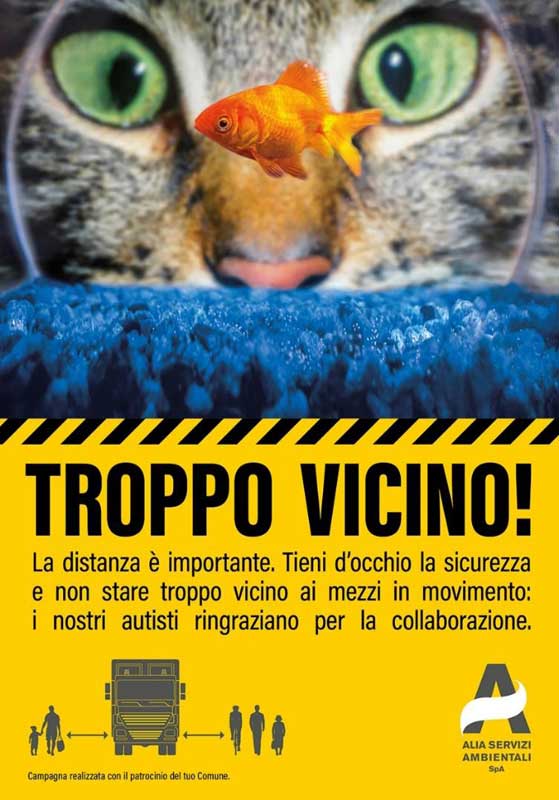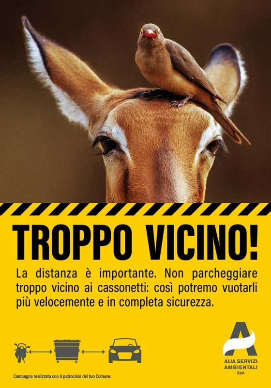 Con un tono di voce leggero ed a volte ironico, la campagna affronta un tema importante e delicato, come quello della sicurezza stradale, utilizzando i codici visivi tipici della segnaletica relativa alla sicurezza, capace di coinvolgere gli interlocutori, strappando - magari - anche un sorriso. Nei messaggi, precisi e diversi a seconda della collocazione, l’azienda ringrazia i cittadini per l’eventuale attesa, ricordando il valore del lavoro quotidiano per la città e per l’Ambiente. Segni grafici e testimonial d’eccezione del mondo animale si fanno portavoce dei messaggi - “Troppo vicino. La distanza è importante. Non parcheggiare troppo vicino ai cassonetti: così potremo vuotarli più velocemente e in completa sicurezza”, “Grazie per l’attesa. Il tuo minuto in coda salva l’ambiente. Andiamo via rapidamente”, “Porta pazienza. CI basta qualche attimo del tuo tempo per avere una città pulita. Ci spostiamo appena possibile…”, “Furia? L’è un bel cavallo!”…- che, con un linguaggio diretto ed a volte provocatorio per attirare l’attenzione, senza tuttavia mai banalizzare l’argomento affrontato, reclamano un pò di spazio e richiedono collaborazione per mantenere una debita distanza e lavorare rapidamente e in completa sicurezza.